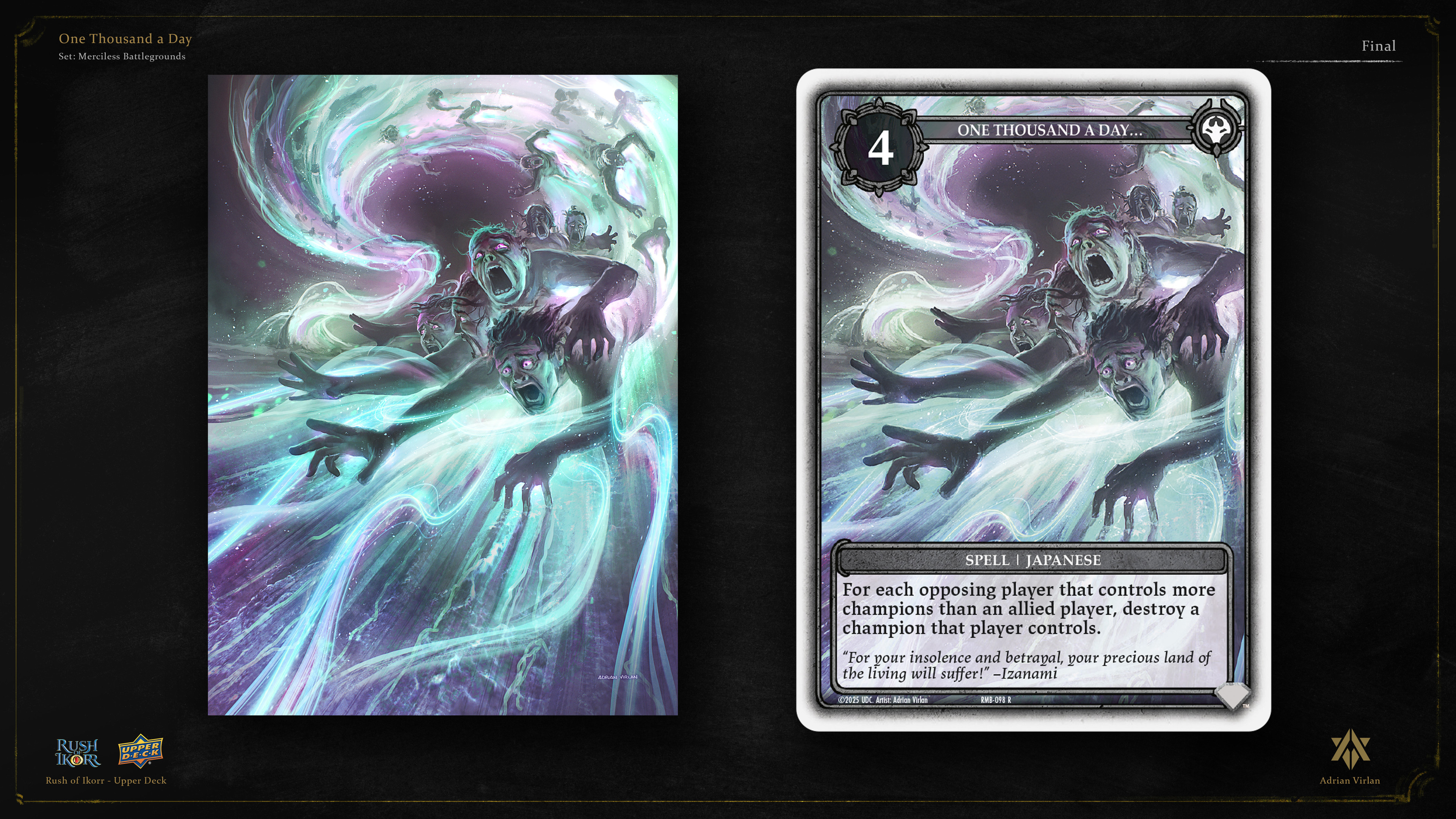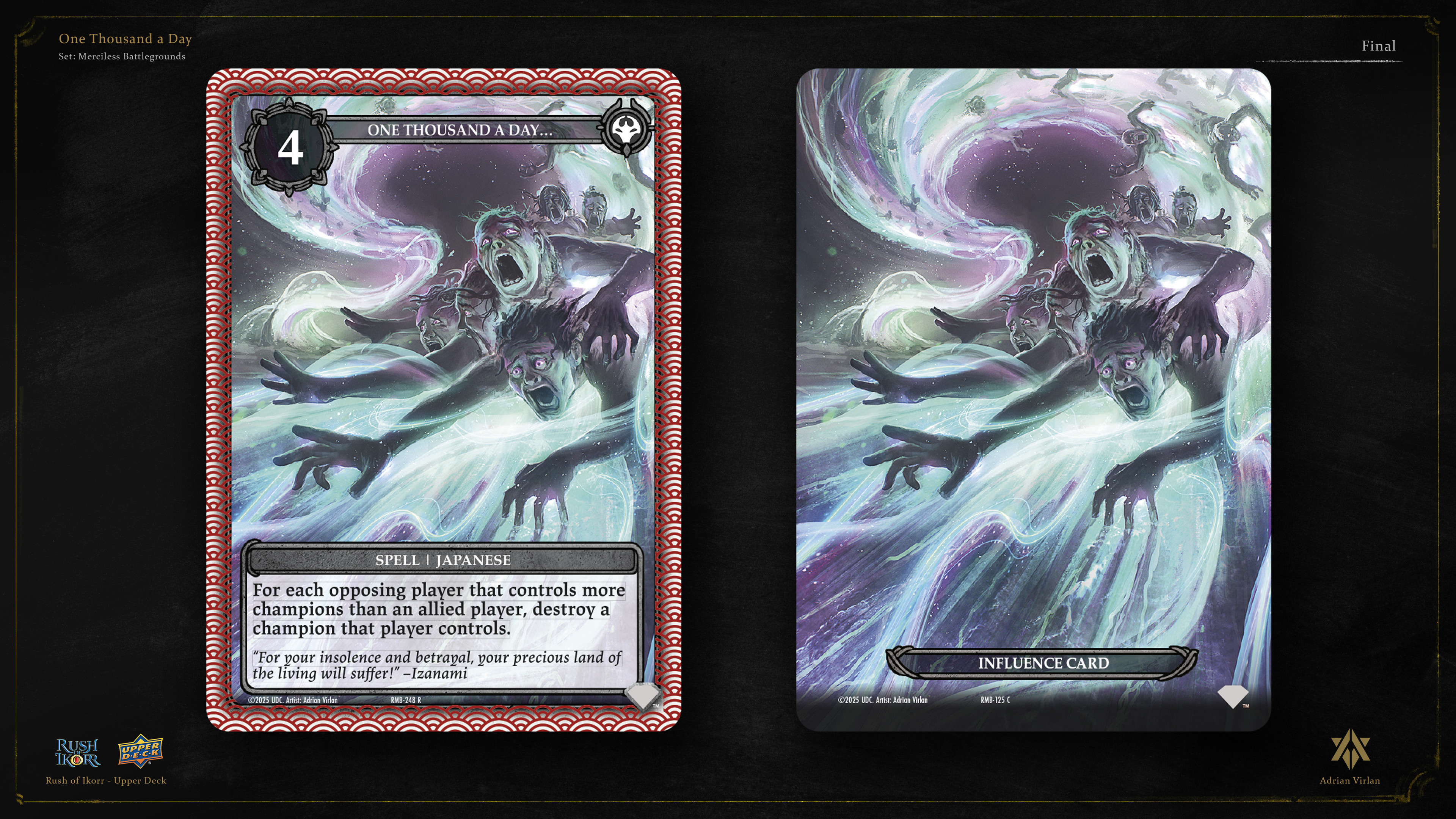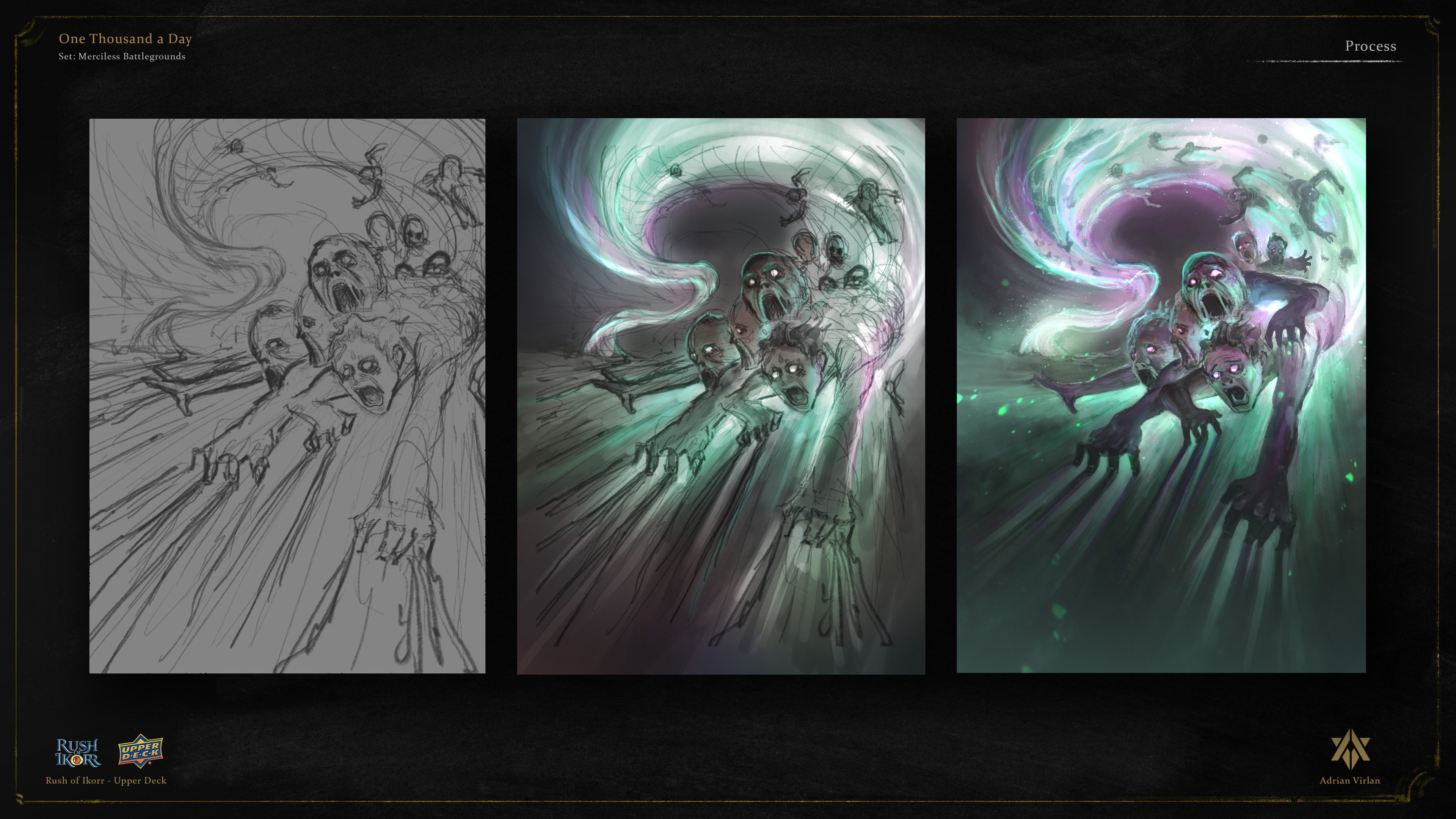 Work done for the second set of Upper Deck's TCG "Rush of Ikorr" a good while ago—Merciless Battlegrounds. Link to card here: https://my.upperdeck.com/public/roi/cards/389 Scrollwork frame here: https://my.upperdeck.com/public/roi/cards/539